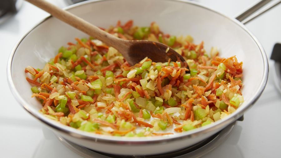 En el mismo sartén, coloca el aceite de oliva y agrega la cebolla picada, cocina a fuego mediano hasta que esté cristalina, agrega el ajo y cocina por 2 minutos. Incorpora el celery y la zanahoria rallada, mezcla y cocina por 3 minutos mas.
