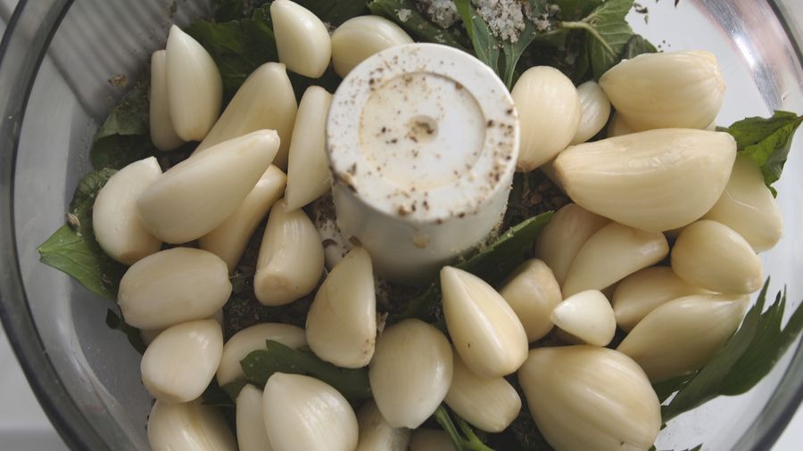 En un procesador de alimentos procesa el jugo de naranja agria, ajos, perejil, culantro, orégano seco, sal y pimienta. Reserva 1/2 taza de esta preparación.