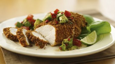Hornea de 15 a 20 minutos, volteándolo una vez, hasta que el pollo ya no esté rosa y el pan panko tome un color café dorado. Sirve con yogurt y rebanadas de lima.