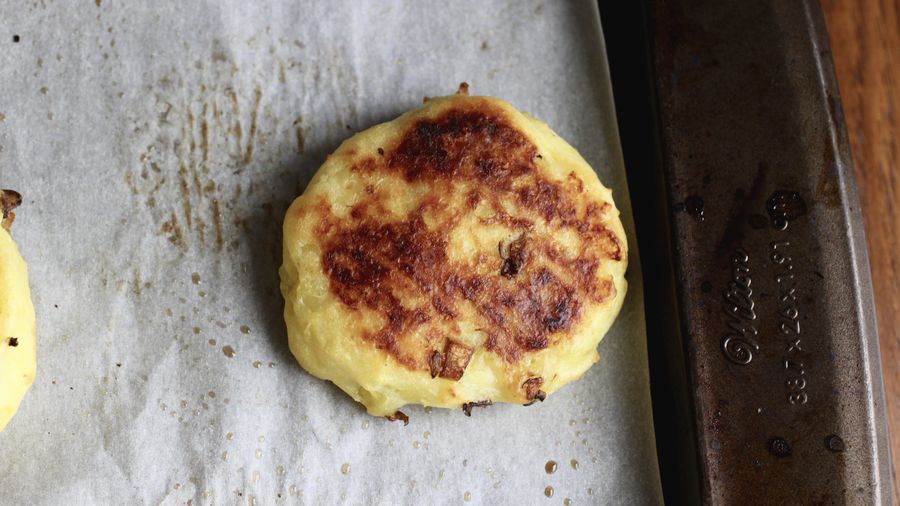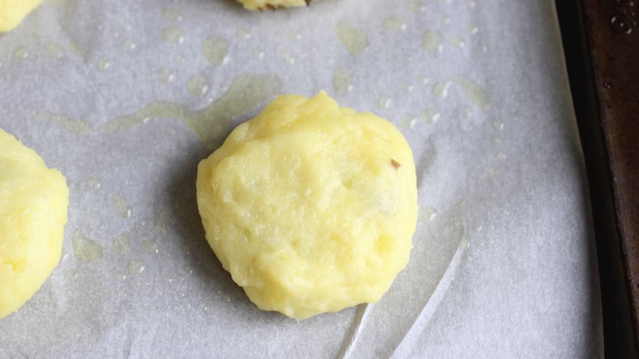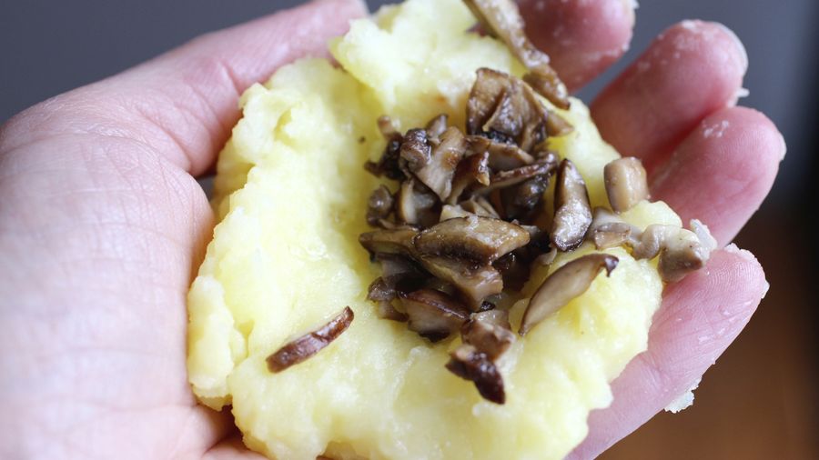 Cuando todo esté frío y manejable forma bolitas con la mezcla de papa. En el centro de la bolita, pon un poco de la mezcla de los champiñones sofritos, forma medallones cerrando los champiñones con la mezcla papa.