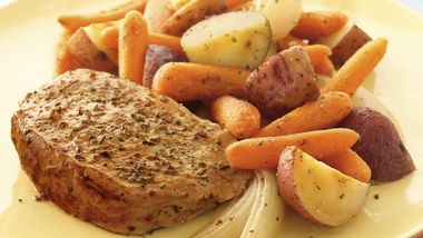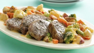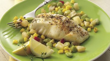 Los sazonadores simples añaden sabor al aderezo italiano. Aderezan el mero (halibut) común y las verduras.