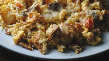 Mi abuelo y mi familia son de Chihuahua, México. Luego se mudaron a la ciudad de El Paso, Texas, como muchas otras personas durante el comienzo de la década de los treinta. Me encanta escuchar sus locas historias de su niñez: cómo ganaban dinero y cómo se divertían. Pero más que nada me interesaba saber qué comían. Eran tan pobres que tenían que usar su creatividad para cocinar. Muchas veces, mi abuela mezclaba ingredientes estadounidenses con comidas mexicanas tradicionales. Esta combinación de culturas ahora se conoce como gastronomía Tex-Mex, y mi abuelo es un experto en esa materia. Uno de mis platos Tex-Mex favoritos es el conocido como migas. Es parecido a los chilaquiles, con la diferencia que no lleva chiles, por lo que es más apto para niños. Y es muy fácil de preparar: huevos revueltos mezclados con tiras de tortillas, cebollas picadas y mucho queso. ¡Apuesto que en aquel entonces ni se imaginaban que estaban preparando un plato sin gluten! Hay diferentes maneras de hacer este plato, dependiendo del país de origen. En Ciudad de México se trata de una sopa, mientras que en España se preparan con pan y se sirven como tapas para acompañar las costillas de cerdo. ¡Prueba esta delicia Tex-Mex!