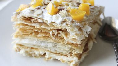 Ensamblaje: Toma una capa de hojaldre caramelizado y agrega una capa la crema pastelera en la parte superior, luego una capa de melocotones. Coloca otra de masa de hojaldre en la parte superior de la crema. Agrega más crema pastelera y melocotones. A continuación, añade la última capa de hojaldre.
