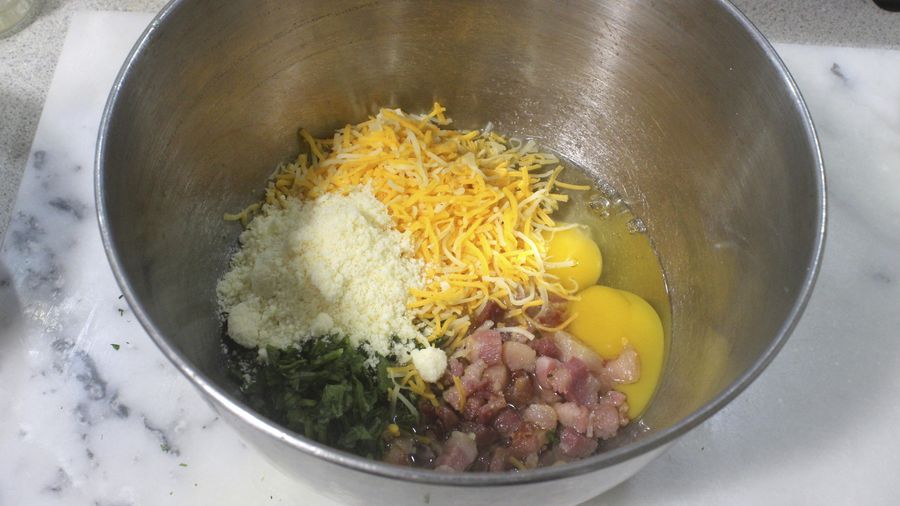 En un recipiente mediano, mezcla el jamón, queso, huevo, perejil.