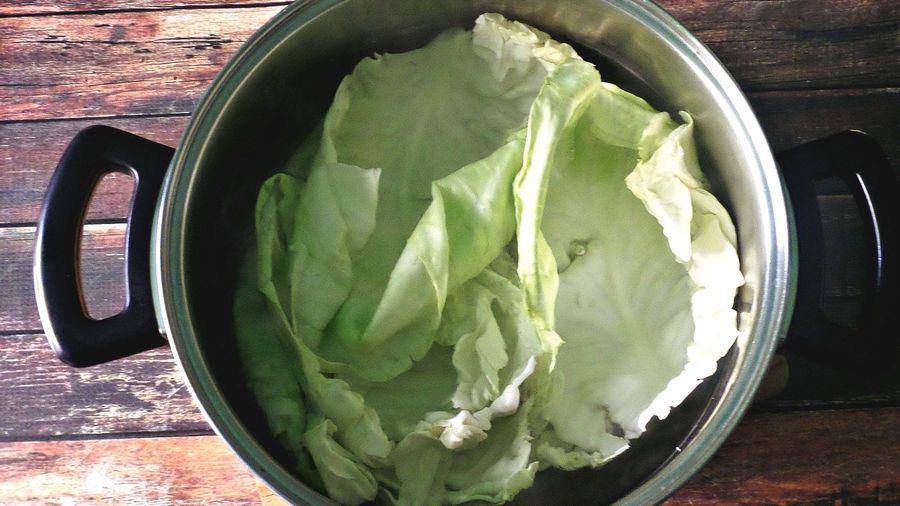 Calienta el horno a 375°F. Retira 6 a 8 hojas de una cabeza de repollo, cuidando mantener las hojas enteras.