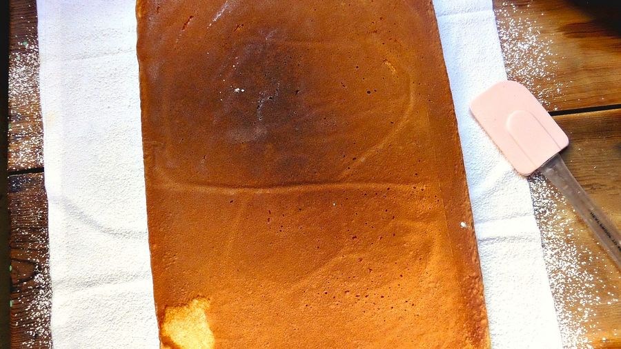 Extiende una toalla de cocina limpia en una mesa. Espolvorea el azúcar pulverizada sobre la toalla. Vierta el pastel caliente sobre la toalla de cocina. Retira la charola y el papel encerado o papel aluminio. Cuidadosamente, enrolla el pastel junto con la toalla de cocina comenzando con la parte más angosta. Deja enfriar el pastel unos 10 minutos. Refrigera el pastel, aun envuelto en la toalla, por 30 minutos.