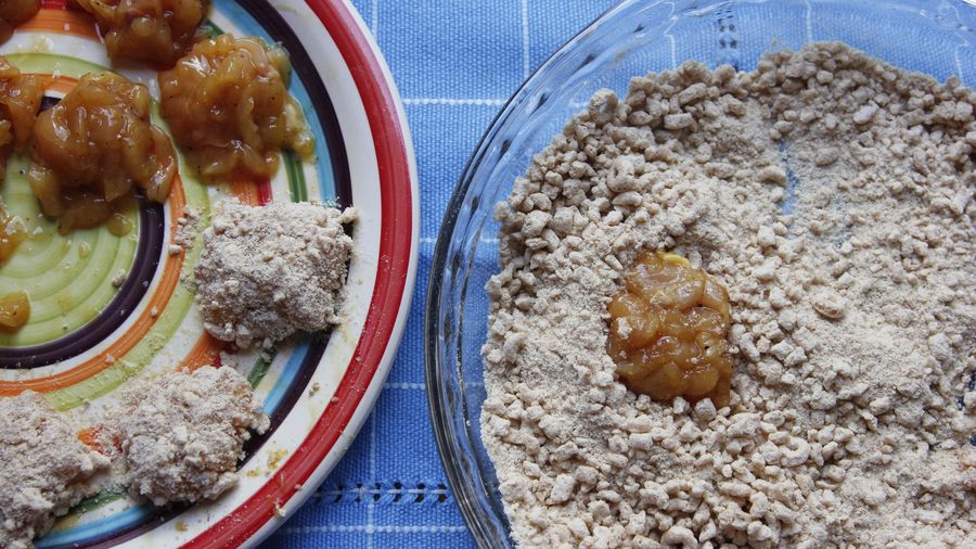 Mientras el aceite se calienta, ve formando los nuggets de pollo. Toma un poco de pollo cúbrelo con el cereal triturado y dale forma con tus manos. Repite hasta terminar con todos. IMAGE 3