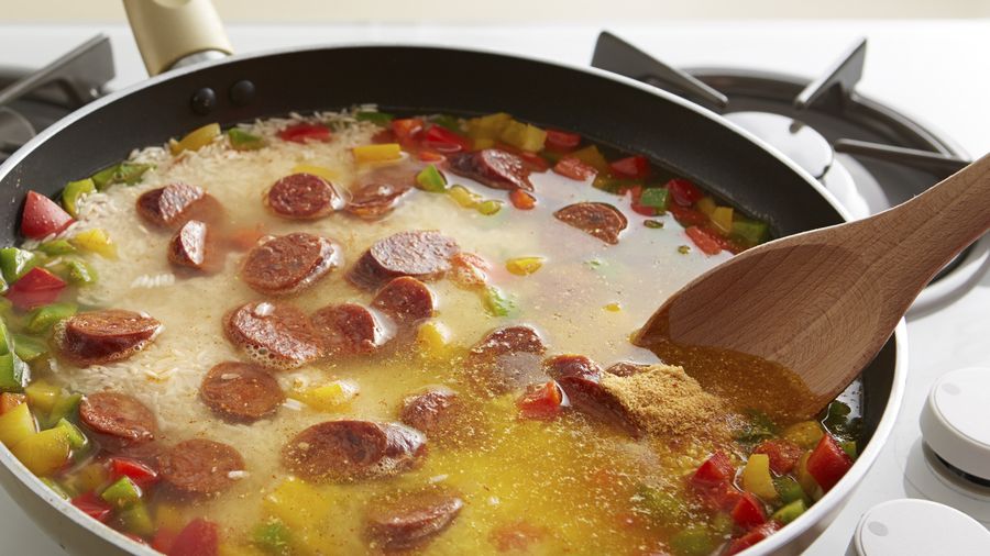 Agrega el aceite de oliva y sancocha el ajo picado con la combinación de chiles morrones picados, agrega el arroz, el chorizo frito, y el agua. Sazona con los cubitos para cocinar arroz amarillo, la sal y la pimienta, revuelve con una palita, baja el calor y tapa.