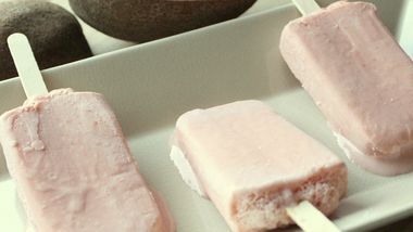 Vierte un chorrito de jugo de camu camu en cada vasito y pon en el congelador. Cuando esté firme, agrega la misma cantidad de yogur y vuelve a congelar. Antes de que se endurezca del todo, inserta el palito firmemente en el centro.