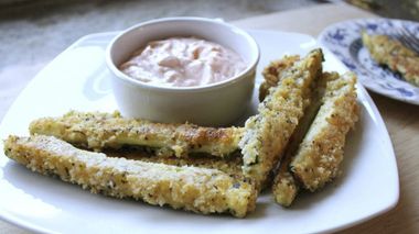 • Cubiertos con cereal triturado, mezcla de condimentos y horneados, estos palitos de calabacín fresco son un divertido apertivo para fiestas.