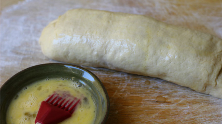 Acomoda el pan en una bandeja para horno y barniza la masa con el huevo batido.