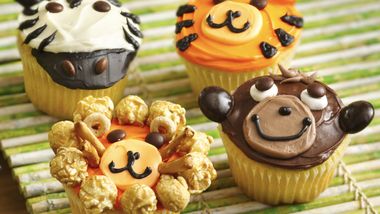 Frost cupcakes with frosting. Decorate with whole or cut-up gumdrops, candies, cut-up or thinly rolled fruit snacks and gel to look like ladybugs, bumblebees, butterflies, caterpillars and beetles.