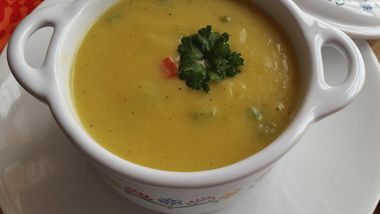 En un plato coloca 2 hojas de lechuga como decoración. Pon las papas y cúbrelas con la crema de pimiento. Agrega las rebanadas de huevo, y espolvorea perejil picado como decoración.