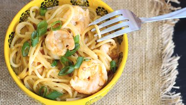 1Cuece la pasta como se indica en el paquete. Coloca los camarones en un colador; enjuágalos brevemente con agua fría. Déjalos reposar en el colador, hasta que la pasta se cueza. Para escurrir la pasta, viértela sobre los camarones en el colador.