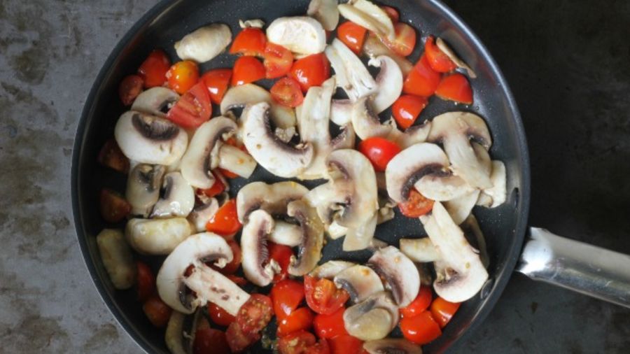 Añade los tomates y los champiñones y rehógalos en el aceite hasta que ablanden un poco.
