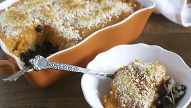 3Vierte la mezcla en recipiente para hornear ligeramente engrasado y nivela la superficie con una cuchara.