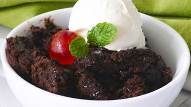 Si es posible, retira la olla removible de la olla de presión y colócala en la rejilla para enfriar. De lo contrario, apaga la olla. Destápala; deja reposar el pastel destapado de 30 a 40 minutos para que se enfríe antes de servirlo. La salsa se espesará a medida que se vaya enfriqando. Transfiere las porciones de pastel cálido a los platos. Vierte la salsa encima. Sirve con helado vegano y frutas frescas.