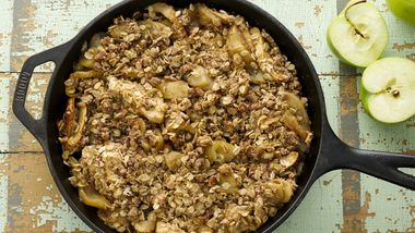 Precalienta el horno a 325ºF. Rocía con spray para cocinar un molde de vidrio para pie de 9 pulgadas de diámetro. En un tazón hondo mediano, mezcla las manzanas, la canela y la nuez moscada. Vacía en el refractario para pie.