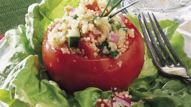 • Existen muchos ingredientes que son llenadores y a la vez bajos en calorías y grasas. La quinoa, un grano antiguo, es un excelente ejemplo. Para este año nuevo, una de mis metas es incorporar esa pequeñita semilla en muchos de mis platos. Como los pimientos dulces están en temporada, decidí crear mi propia versión de los chiles rellenos pero con un toque más sano. En esta receta, horneé los pimientos y los dejé en escabeche para realzar su dulzura. Así también pude equilibrar su sabor con una variedad de verduras picadas y un poquito de queso cotija desmenuzado.