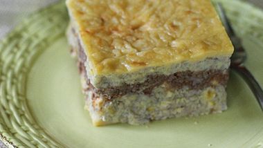 La capa final debe ser de plátanos. Echa el batido de huevos y hornea a 350°F por 30 minutos. Deja reposar para que no se desmonte al servirlo.