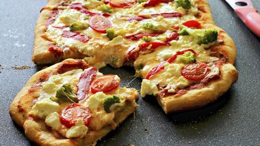 5Una vez que lapizza esté lista, córtala en porciones pequeñas y a ¡disfrutar!