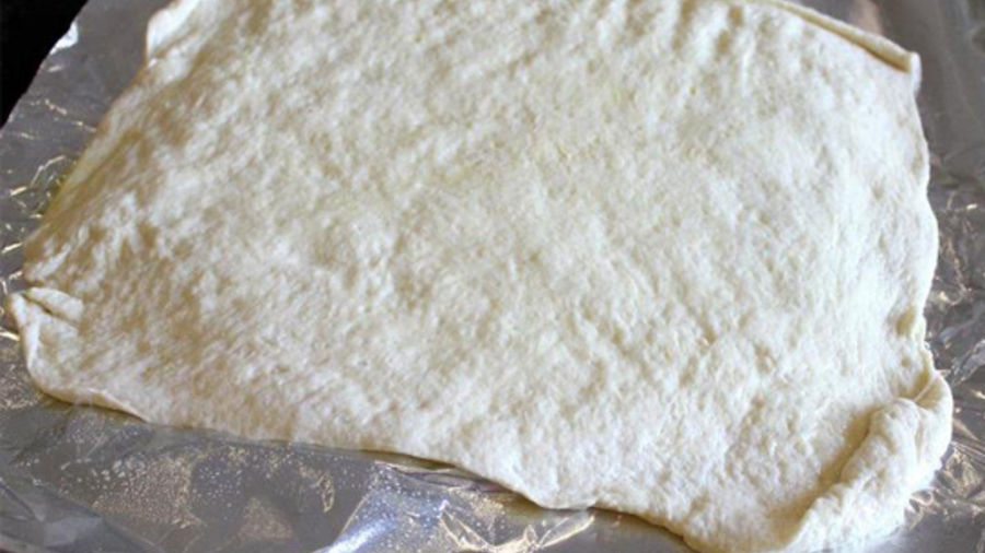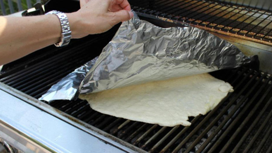 2Pon la masa en la parrilla. La masa va directamente sobre los fierros de la parrilla y el papel de aluminio quedará sobre la masa. Retira el papel de aluminio.