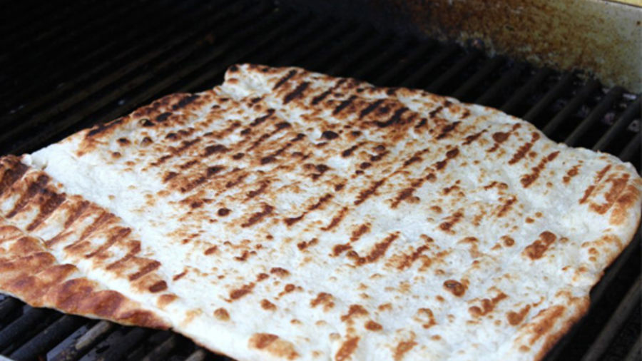 1Precalienta la parrilla de gas o de carbón (grill).Una vez que esté caliente, con una brocha unta aceite de canola sobrela parrilla. Pon la masa sobre papel de aluminio grueso previamente engrasado.