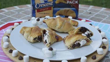 Hornea de 12 a 15 minutos o hasta que esté dorada. De inmediato, úntala con la crema de avellana; espolvorea con las chispas de chocolate amargo y de chocolate semiamargo. Hornea de 1 a 2 minutos más o hasta que el chocolate empiece a derretirse.