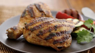 Voltea el pollo; cubre la parrilla y cuece de 20 a 30 minutos más, volteando de vez en cuando, hasta que el jugo del pollo salga claro al cortar hasta el hueso la pieza más gruesa (170°F para pechugas; 180°F para muslos y piernas).