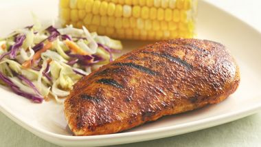 Coloca el pollo en la parrilla, a fuego medio. Tapa la parrilla; cocina 5 minutos. Unta el pollo con 2 cucharadas de salsa para barbacoa. Cocina de 5 a 7 minutos más o hasta que el jugo del pollo esté claro al hacer un corte en el centro de la parte más gruesa (170°F). Voltea el pollo; úntalo con la salsa para barbacoa sobrante. Sirve el pollo cubierto con salsa blanca de barbecue.