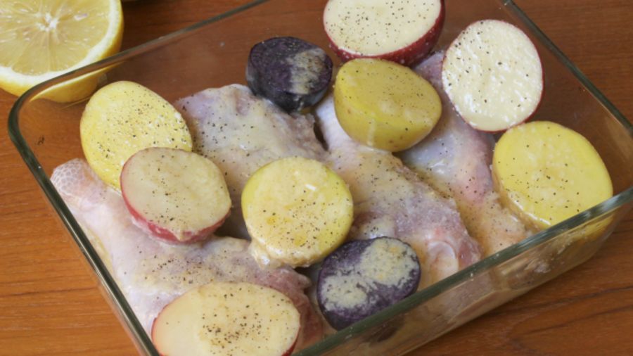 Deja hornear por otros 10 minutos hasta que el pollo y las papas se encuentren completamente cocidos.