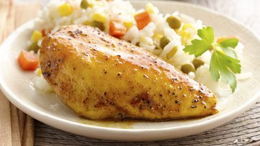 3Hornea de 30 a 35 minutos o hasta que el jugo del pollo se vea claro y cuando insertando un termómetro en la parte más gruesa junto al hueso lea 170°F en la pechuga del pollo y 180°F en las otras piezas.
