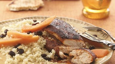 4Mientras tanto, en una olla de 1 cuarto de galón, calienta hasta hervir 1 y media tazas de agua y un cuarto de cucharadita de sal. Añade el cuscús. Tapa, retira del fuego y deja reposar 5 minutos o hasta que el agua se absorba. Revuelve el cuscús con un tenedor.