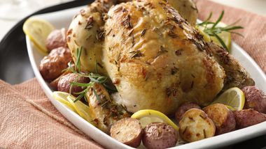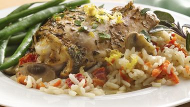 Sirve en una bandeja, acompañado de vegetales o papas y adorna con unas ramitas de tomillo.