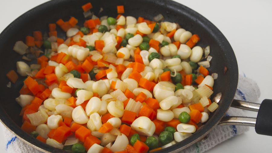 Aparte calienta en una sartén el aceite y fríe la cebolla y el ajo, a fuego medio, hasta que estén muy suaves. Agrega las verduras cocidas al vapor, también el maíz desgranado y la papa cocida. Sazona con un poquito de sal y pimienta. Apaga el fuego y reserva.