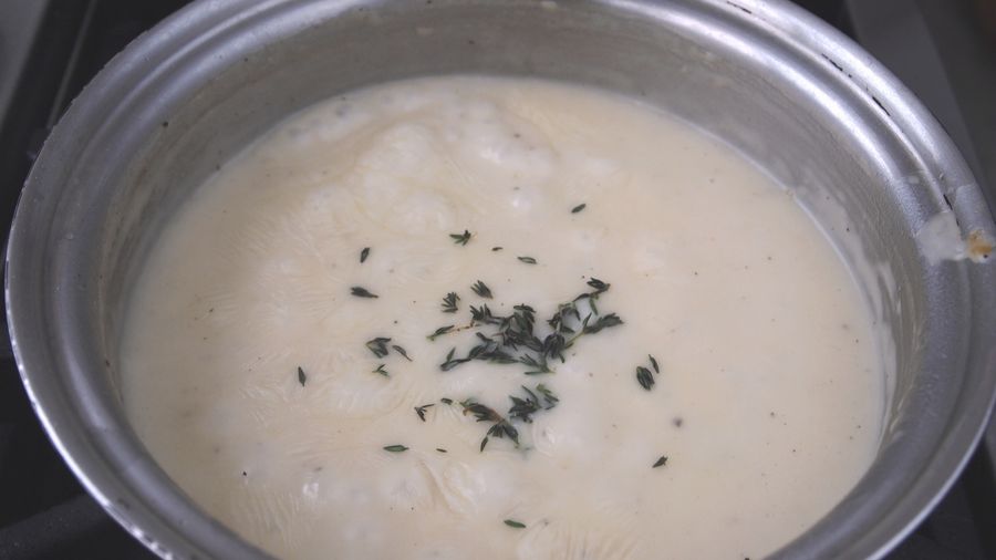 En otra olla vas a preparar la salsa. Derrite la mantequilla a fuego medio alto. Incorpora la harina revolviendo rápidamente hasta que esté bien incorporada. Agrega el caldo de pollo sin dejar de remover rápidamente. Cuando la mezcla esté homogénea añade sal, pimienta, hojitas de tomillo, baja el fuego y cocina hasta que espese.