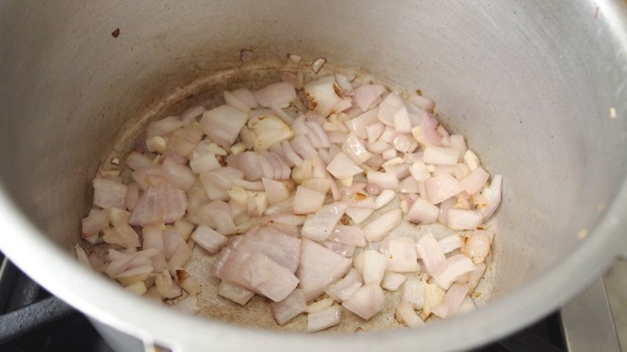 Caldo: Calienta el aceite en una olla a fuego alto. Sofríe la cebolla y el ajo.
