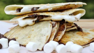 • La mezcla de sabores dulces con salados puede dar vida hasta a una simple quesadilla. Esta botana se convierte en postre decadente con el toque final de mantequilla, azúcar y canela, ingredientes que le dan el gusto conocido de los churros. Pica este postre dulce en trocitos para transformarlo en un aperitivo elegante, o servirlos como un bocadito sustancioso después de la escuela. Coordina las frutas y las bayas que incorporas con las estaciones y lo que está disponible temporalmente.