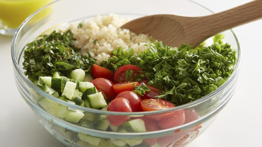 En un tazón mediano mezcla el pepino, los tomates, las hierbas, los cebollines y la quinoa; revuelve bien.