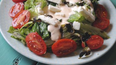 Pon en platos individuales. Vacía el aderezo encima de la lechuga, luego el jitomate, tocino, y los crutones a cada trozo o rebanadas de lechuga. Sirve.
