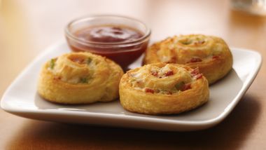 • Sirve estas botanas que serán el deleite de tu fiesta- utilizando los cuernitos o medias lunas refrigeradas de Pillsbury® y tocino.