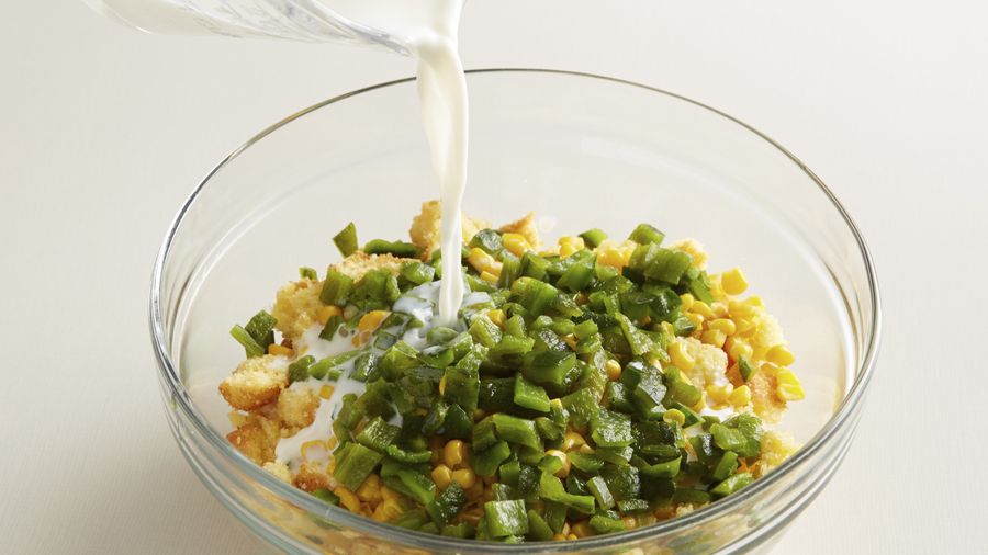 Coloca el pan de elote desmoronado en un tazón grande; agrega la leche, la crema, los chiles poblanos y los elotitos. Combina bien usando tus manos, sazona con sal.
