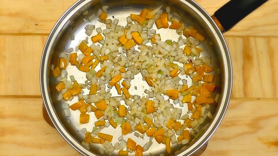 Calienta el aceite en una cazuela grande a fuego medio-alto. Sofríe la cebolla y el chile morrón por 2 a 3 minutos hasta que la cebolla esté traslúcida. Agrega el ajo y sofríe por otros 30 segundos.