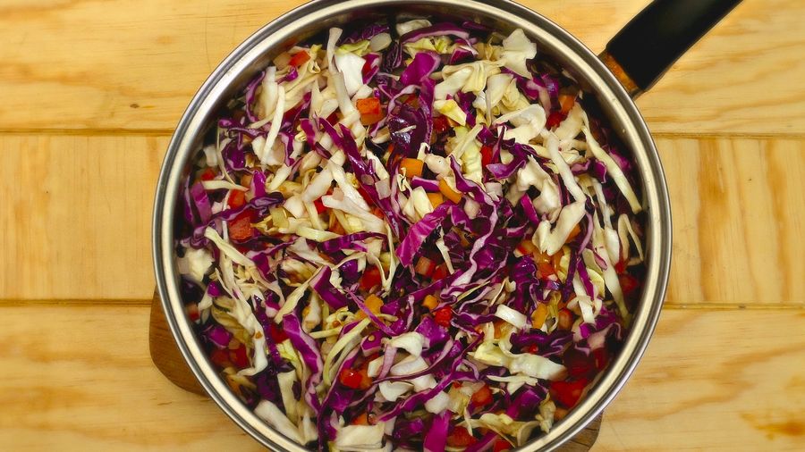 Agrega el repollo verde y morado; sofríe por 5 minutos, revolviendo de vez en cuando.