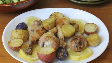 Coloca en una bandeja refractaria el pargo y cubre con las papas. Esparce el jugo de limón restante, perejil, aceite y el vino uniformemente. Tapa con papel de aluminio y mete al horno a 350°F durante 30 minutos.