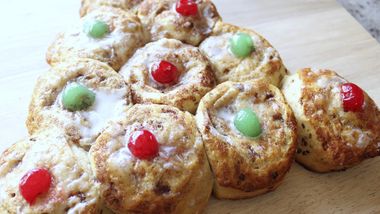 Cuando los rollos de canela estén listos, coloca 4 tiras de tocino en cada rollo de canela, simulando la cola del pavo. Como los ojos, utiliza 2 Cheerios™ y para la nariz, 1 candy corn.