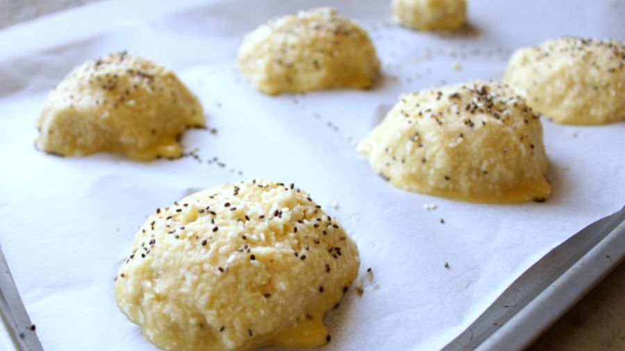 Coloca el papel de horno (parchment paper) en una bandeja para hornear. Forma 4 bolas de tamaño uniforme y colócalas sobre el papel de horno. Espolvorea con las semillas de sésamo, la cebolla seca, y el ajo picado. Presiona ligeramente en la parte superior para que se adhieran a los rollos.