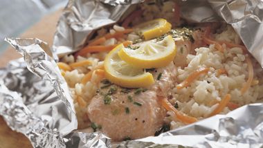 Rocía ambos lados de las piezas de salmón con spray para cocinar. Unta la sal para sazonar en ambos lados del salmón. Coloca una hoja de papel aluminio grueso sobre la rejilla de la parrilla y calienta a fuego medio. Coloca el salmón sobre el papel aluminio, con la piel hacia abajo. Tapa la parrilla; cocina de 8 a 10 minutos o hasta que el pescado forme hojuelas con facilidad al introducir un tenedor. Retira del fuego.