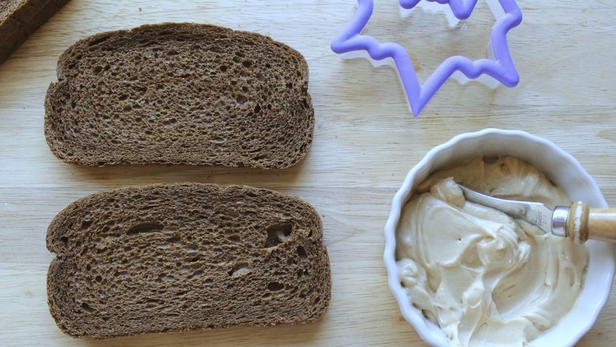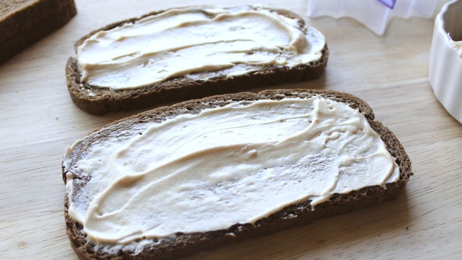 Prepara el sándwich y unta el spread de yogurt sobre el pan como lo harías con cualquier otro sándwich.