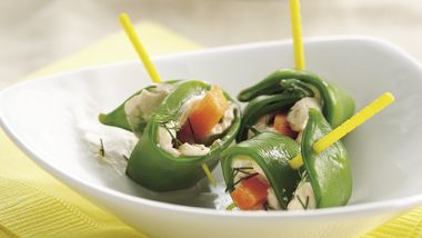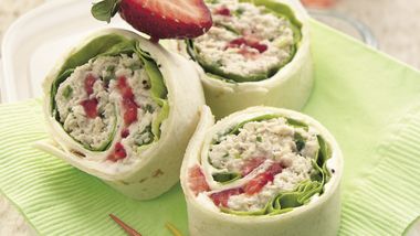 Gira suavemente hacia arriba y enrolla el pan. Ata cada sándwich con los cebollines o un pedazo de cebolla larga.